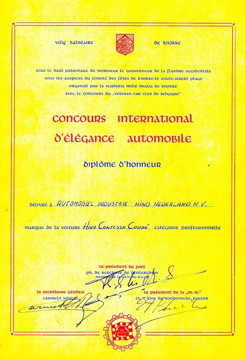画像は、1966年、ベルギー、西フランダース州のクノッケ (Knokke) でのエレガンスコンクールの日野コンテッサクーペの名誉大賞の賞状。