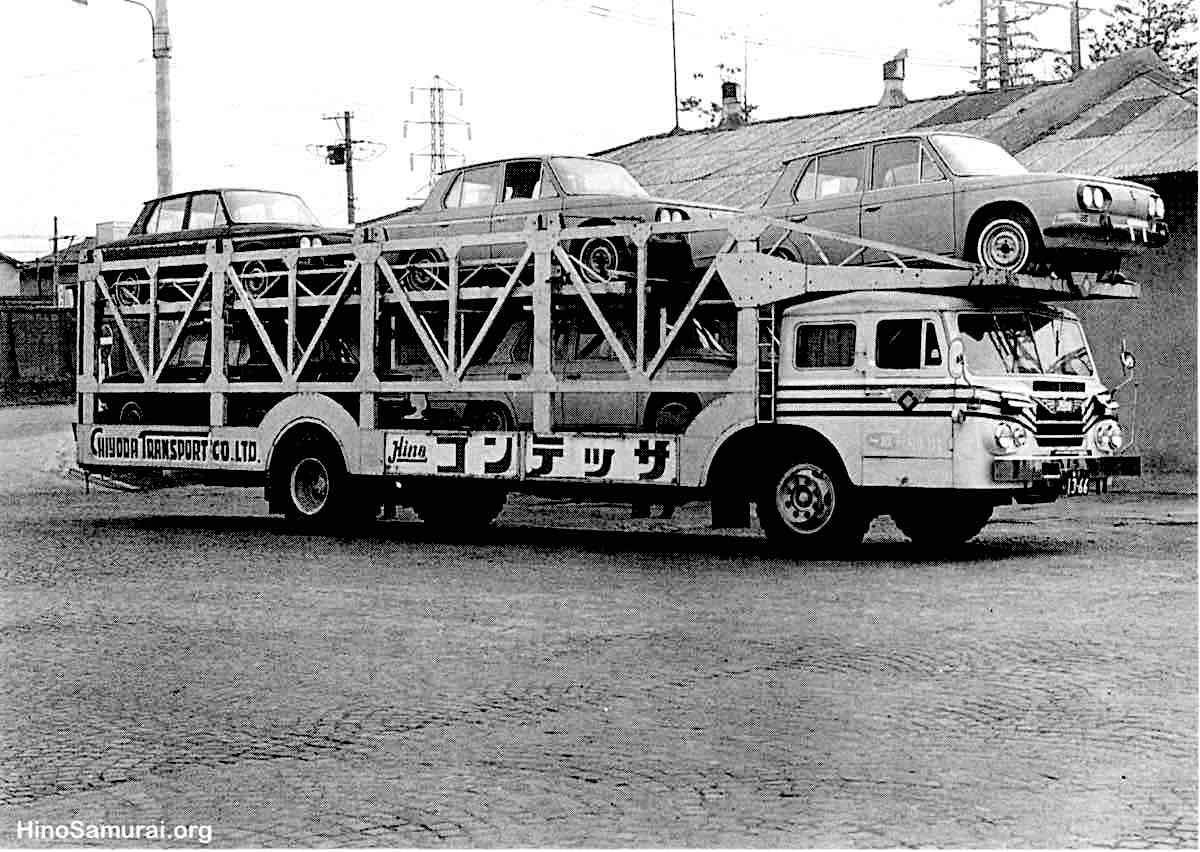 日野コンテッサ1300生産&デリバリー開始 (1964年秋):専用積載車(TH80ベース)でデリバリーされた(1966年7月撮影)。