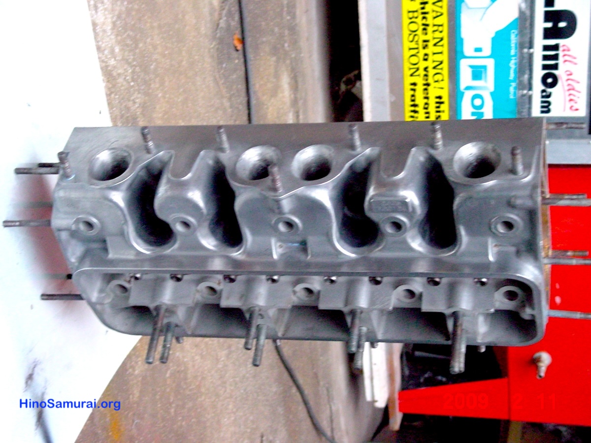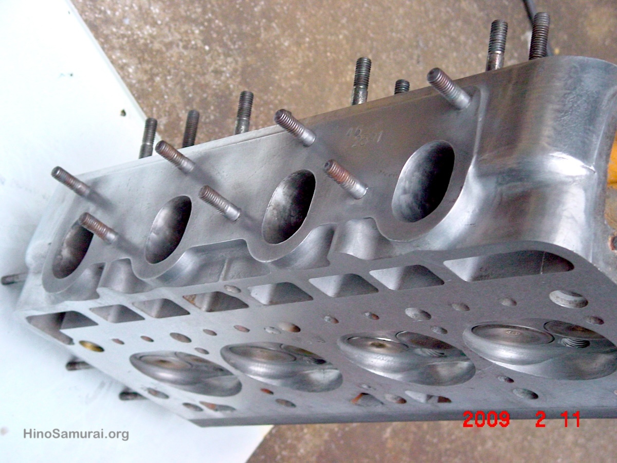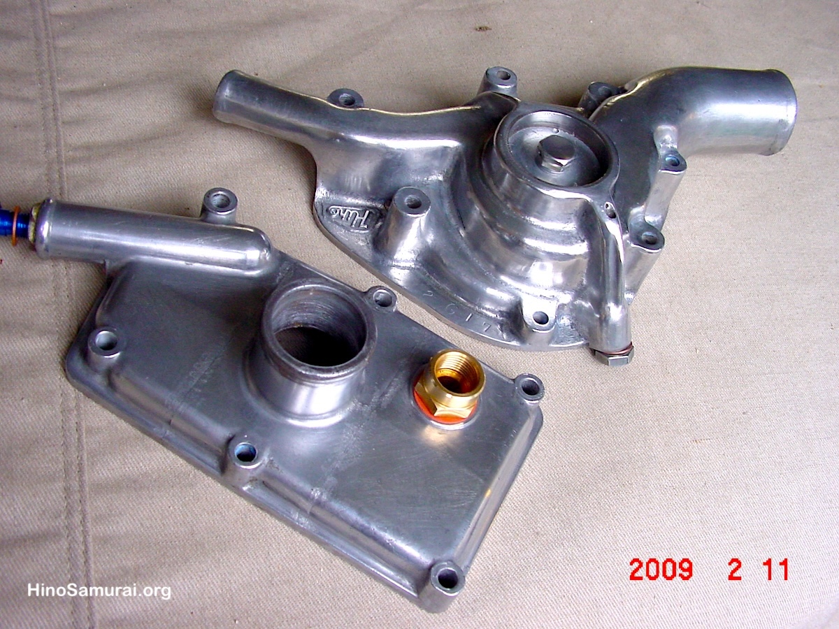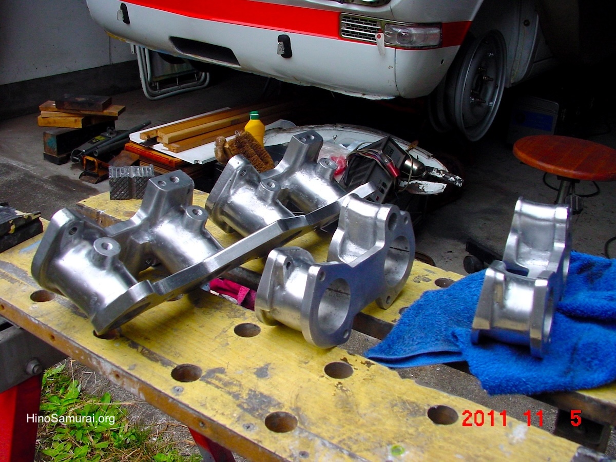 ウォーターポンプのボデーやエンジンヘッドのクーラントのアウトレットケース、そして「Hino」マークや品番の刻印などは目立つように丁寧に磨く!