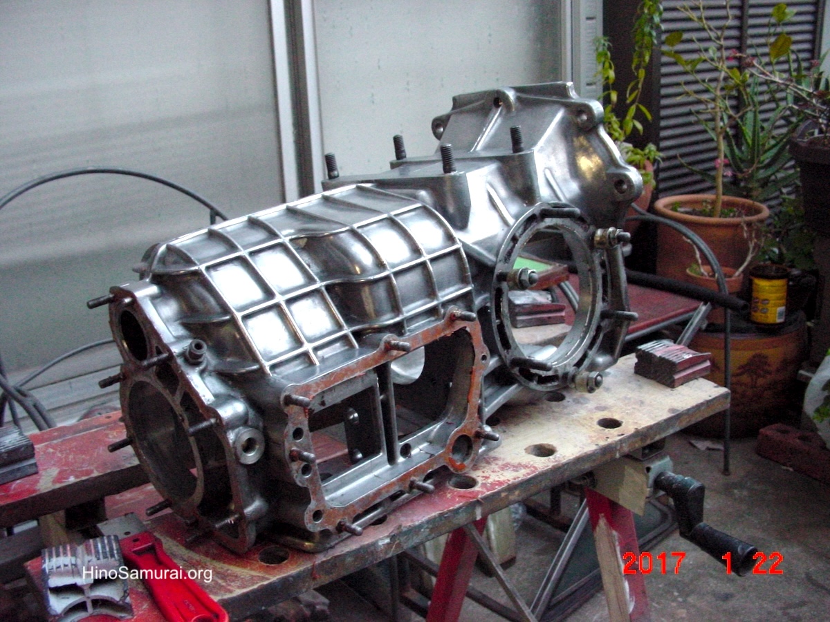 公道復帰時はセダン用ミッションをブラストしてポリッシュ、この段階でFISCO用クロスミッションに切り替えを進めた。ブラストに替えて研磨ペースト3段階を経てポリッシュ。あくまで表面のクリーンアップである。