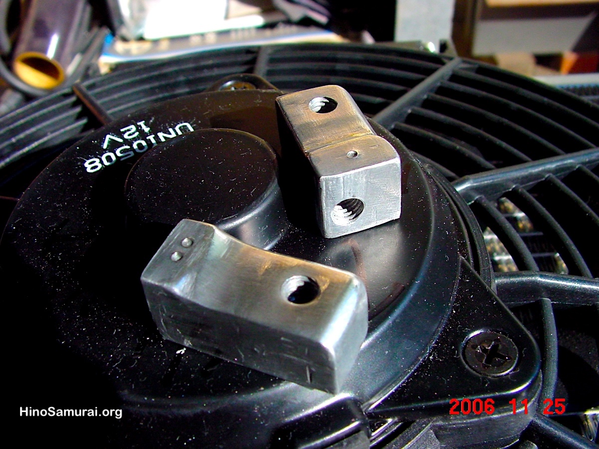後方マウントのラジエータの電動ファン取付のブラケット類、アルミ材の切出し加工後、表面を均一化&整えるためにポリッシュする