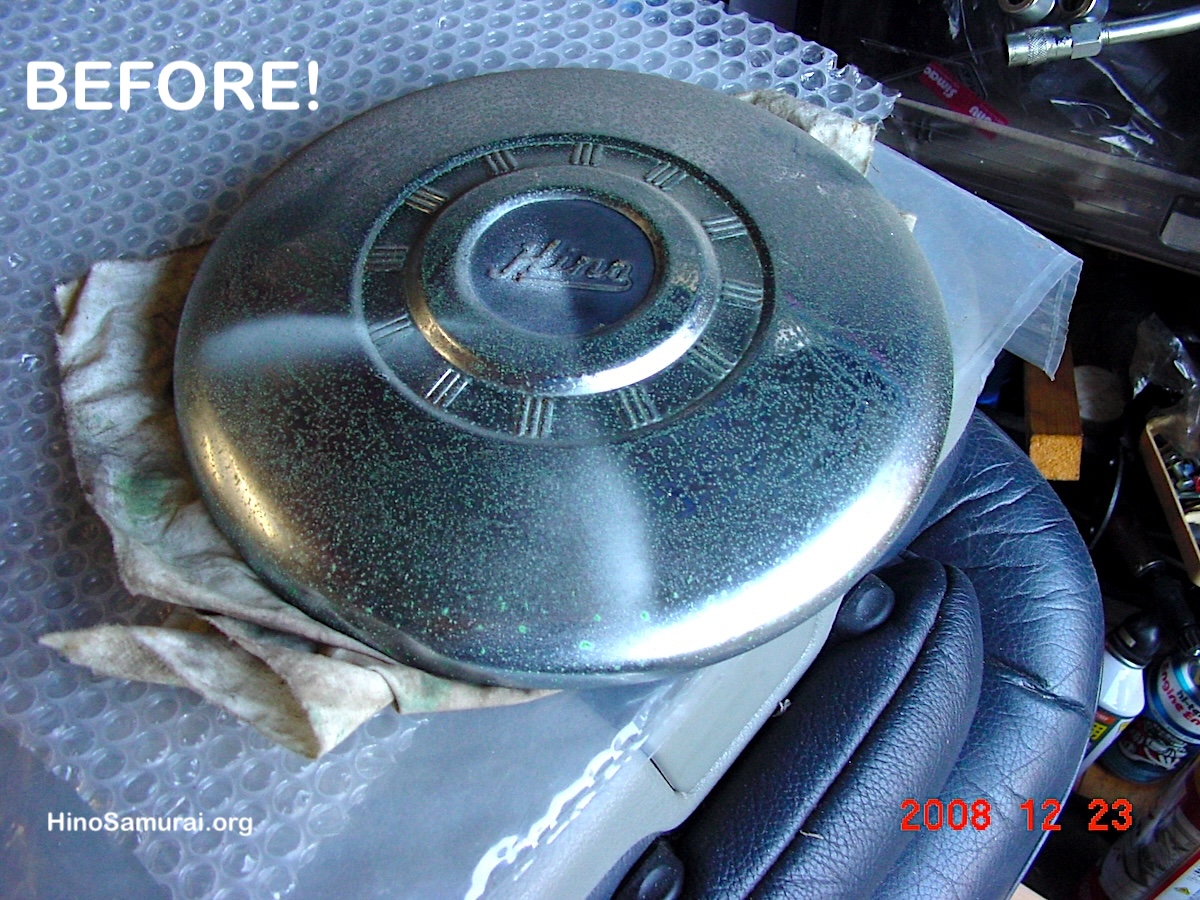 長年使用してなかった14インチホイール用のホイールキャップ、表面の劣化が進んでいた! Dupontの航空機用のケミカルを使用、表面が見事に復活した!