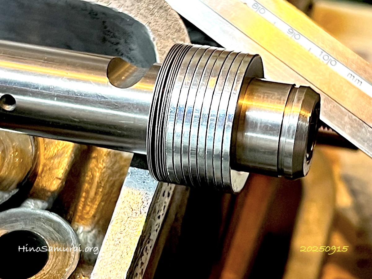 2025.9.15 公道復帰10年、経年劣化修復プロジェクト (126) – ロッカーアームシャフト、スラストシム調整 「2025.8.23 公道復帰10年、経年劣化修復プロジェクト (126) – ロッカーアームシャフト、スラストシム確認」のように内径の調整とバリ取りです。 内径の調整は#400のフラップ&リュータでホンの1秒触るかと言った感じの調整です。試しにロッカーシャフトに入れながら何度が繰り返し都合16枚の調整でした。 バリ取りは薄いステン製0.25mm厚のシムは50mmパッド#3000で内径と外周面をさらうように、厚いスチール製1.5mmのシムは同様にこちらは#1200で処理、これでバリがなくなりスムーズな面になったようです。 画像のように厚いシムは綺麗に揃って並んで良い子になったなと、薄いステンはリュータを当ててる際に若干の歪みが出てしまうようです。素人の工作、これで良しとしました。