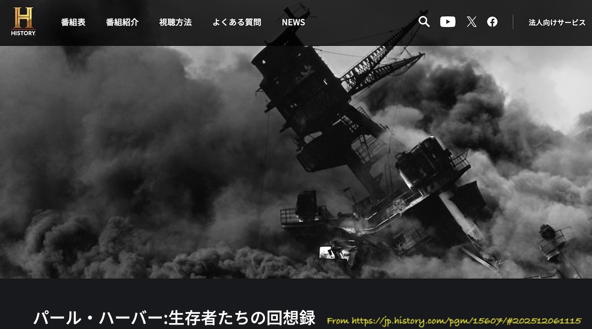 2025.12.6 真珠湾攻撃追悼記念日 – ヒストリーチャンネル 毎年、この時期 (12月7日 – National Pearl Harbor Remembrance Day) になると米国系メディアは繰り返し、あるいは新たなコンテンツを放映します、それはパール・ハーバーの日本の攻撃についてです。 この日の昼前にヒストリーチャンネルで「パール・ハーバー:生存者たちの回想録(あの時、パール・ハーバーでは何があったのか。この番組は、アメリカを守り、偉大な国にした元軍人たちの証言を通して語られる2時間ドキュメンタリーである) 」をチェック、もう何回か観ております。 いつものことですが「米国はこの日本の真珠湾攻撃を絶対に忘れない」と言うです。当然と言えば当然のことでしが、それ以上にDNAに刻み込まれるような強い思いとか強固な信念と想像するものです。 普段の米国人の接触にもそれを肝に銘じています。米国に長期滞在した際には12月7日は日本人は外で出ると危険と注意を受けていました。 参考:2023.12.8 真珠湾攻撃追悼記念日 – 25年前の旅