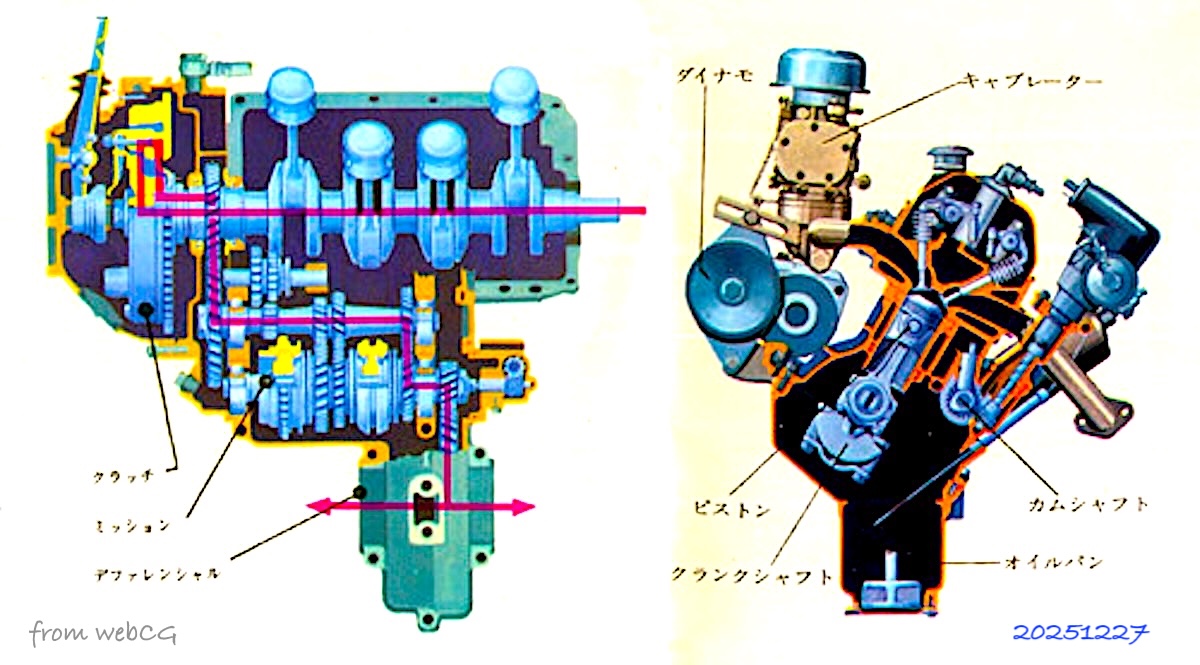 2025.12.27 マツダ キャロル 360 KPDA型エンジン ここのところMazda Miata MX-5 について取り上げました。実はマツダ車、技術的に最も気になるのが画像の1962年発売のキャロルのKPDA型エンジンです。 このようなエンジンが1962年の新型車に搭載したマツダの挑戦力に感服するばかりです。技術的には1900年の早い時代からあるヘミヘッド構造です。この360ccのエンジンに精密機械のようなクロスフローのOHV、ヘッド&ブロックはアルミ、そして5ベアリング機構です。画像のミッション含め驚愕するばかりです。 この技術は後のファミリア、そして1966年発表の1,500cc ルーチェ OHC UB型エンジンへと発展、その際のトランスファーマシンはファミリアのもの (内燃機関 1966年12月) と、マツダのモノづくり戦略は他社を引き離していたと推測します。 一般に「白いエンジン」は浸透しましたが、これらエンジニアリングの本質は語られていないので残念です。マツダのエンジン、「たかが日野 GR100、されどGR100…日野コンテッサ1300のエンジン」に仲間入りさせましょう。