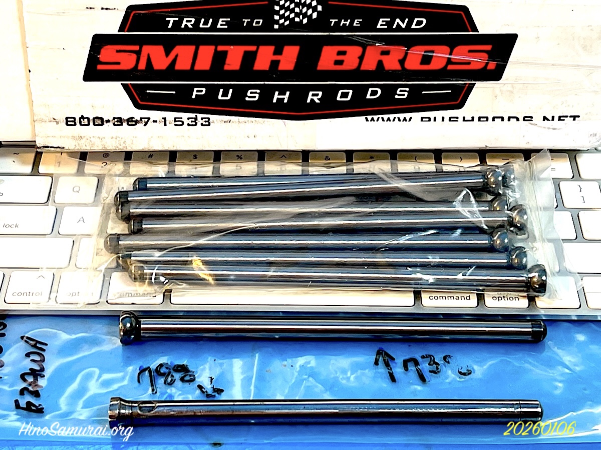 2026.1.6 公道復帰10年、経年劣化修復プロジェクト (155) バルブプッシュロッド製作完了! バルブプッシュロッドの、ダミー (調整式) を自作して完璧を目指して先月、制作会社と相談、60年前にロスのBREのチームサムライが制作を依頼した会社と同じと確信しての判断です。 先方は正確を期すために今手元にあるのを確認したいと、取り敢えずEMS便で発送、やはり自分の勘違いがありました。 X’mas後、制作、米国オレゴンの工場を出て、この日にFEDEXで配送されました。画像下のが60年前、そしてその上が今回制作いただいた最新モノ、共にクロモリ製で新しい長いモノが5gほど軽いです。これで約200kgのスプリング圧に対応、想定圧の三倍以上です。 1953年創業のプッシュロッド専業、今でもNASCARなどの高性能品を一手に担う唯一無二の企業、ホットロッドの原点である「自分のクルマは自分でつくる」のスミス兄弟、創業46年後の1999年、会社は売却しましたがブランドは今でも健在で欧米の良き伝統に感服するばかりです。