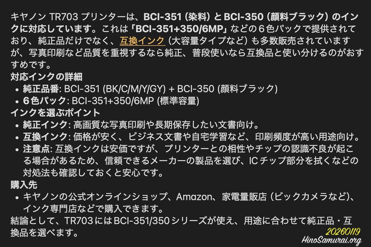 しかし、今日時点で同じGoogle検索をかけると「Canon PIXUS TR703(およびTR703a)に対応している純正インクカートリッジは、BCI-380/BCI-381シリーズです。ご質問のBCI-350/BCI-351シリーズは使用できません」と的確な回答が出ます!
