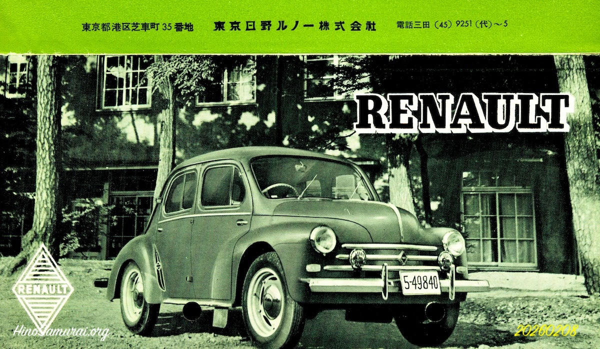 目下、ルノー日野4CVの旧いカタログをレビュー&整理しています。初期のカタログに「東京都港区芝車町 東京日野ルノー株式会社」とあります。