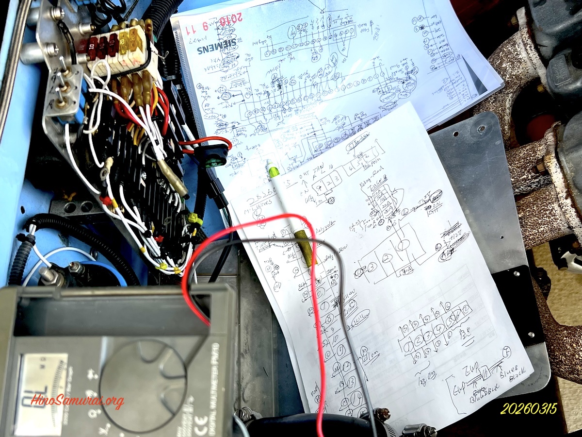 2026.3.15 公道復帰10年、経年劣化修復プロジェクト (174) – ディスビューの仮取付 (3) ポイント式ディスビューの配線、前回のように、記録に残したポンチ絵のような手書き図が経年変化でぼやけてしまい判読不可となりました。 そこで2010年9月11日の画像コピーが残っていることが分かり、読みにくさは画像を処理してモノクロで内容が明確になりました (画像の上側)。 今度こそはコンピュータ上に残しておこうと現物チェックを始めました。今日は手始めに段取りを考えながら試行錯誤をしてました。 2013年型新造コンテッサは画像のようにブロックにしてリヤと共にダッシュボードあたりにメインのブロックを設けました。各ブロックは独立しており、その間の配線はブラインドであくまでブロック上の端子が各機能に繋がるようにしております。(続く)