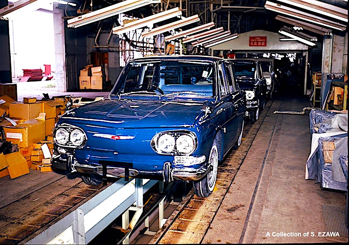 初の自社技術での新しい日野コンテッサ1300がラインを流れる。極初期の装備状況がうかがえる一枚の画像である。