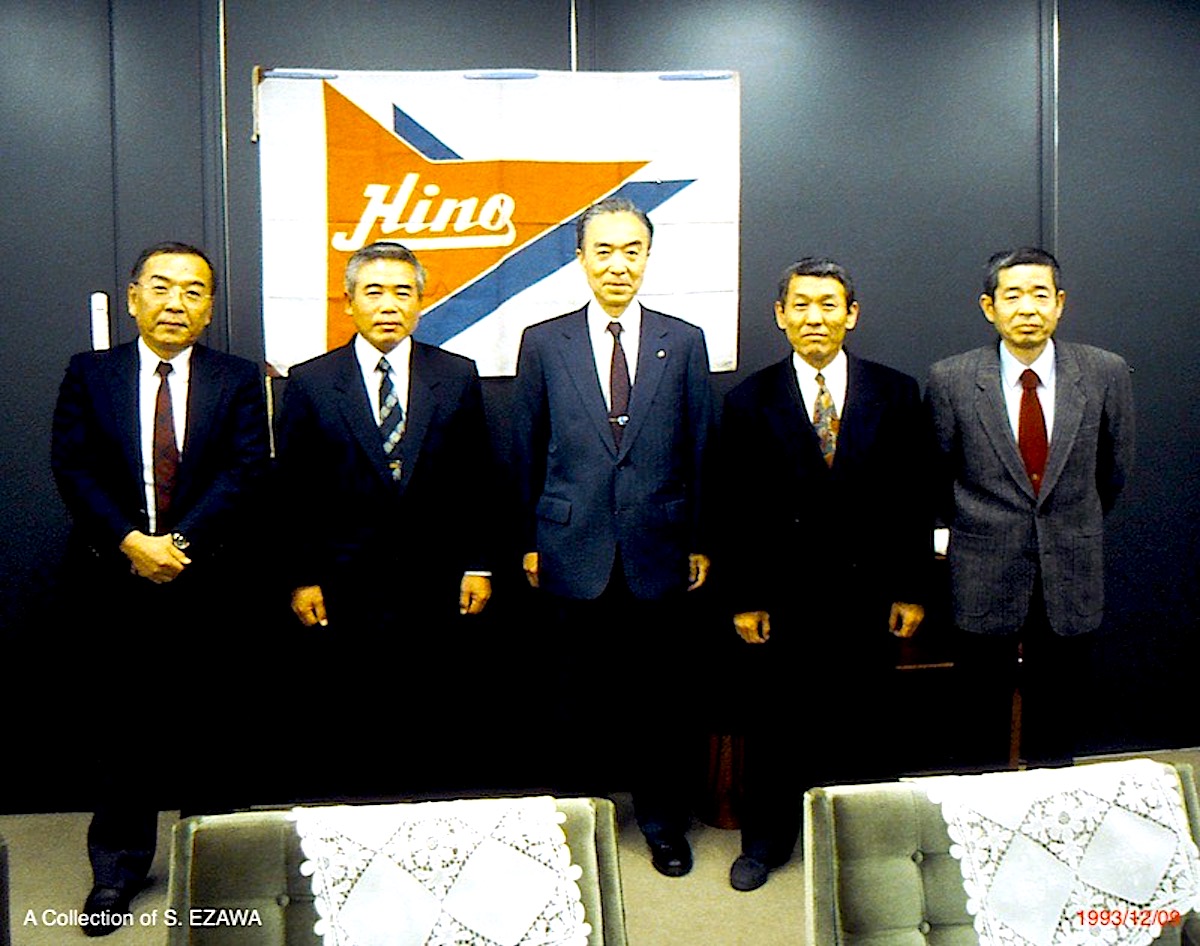 古の栄光の日野レーシング旗を前に、浜口/西村/鈴木/大竹/首藤各氏 (1993/12/09撮影)