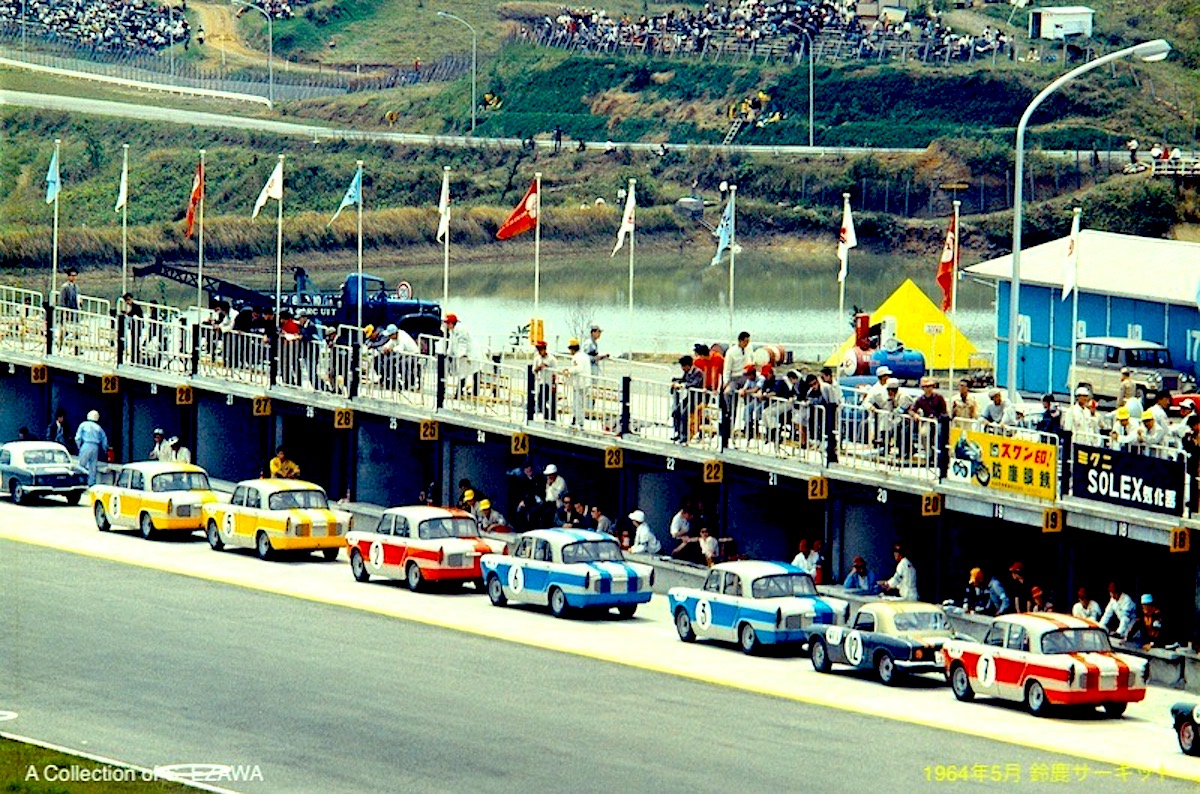 1964年5月の鈴鹿サーキットでの第2回日本GP。GTクラスに出場の日野コンテッサ900ワークス軍団。