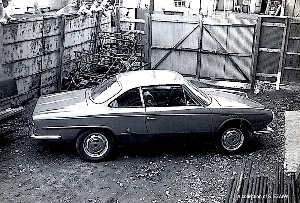 日野工場に納入された日野コンテッサ1300スプリント。しかし、それは表舞台ではなく、工場の片隅の特殊な場所だった。それは火災事故にあった焼け焦げた日野プロトがこの場にあることら想像に固くない。日野自動車含め、一般にコンテッサ900ベースの900スプリントに比較してマッシブになった1300スプリントを低評価されることがある。しかし、およそ5年の時間を経たミケロッティ・デザインの進化を理解する必要がる。よくみればまったく異なるラインであることが理解できる。