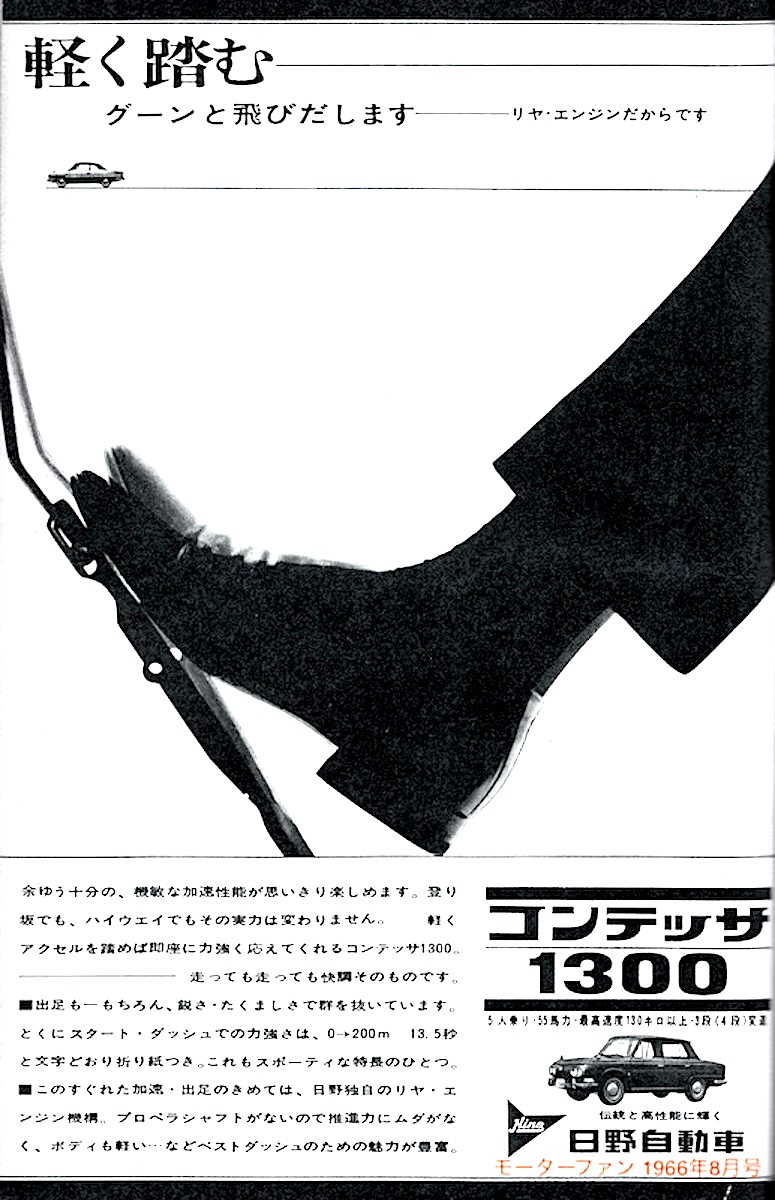 コンテッサ1300を1964(昭和39)年9月1日に発表と同時に販売を開始した日野自動車工業株式会社(以下、日野)はルノー4CVといった軽快なリヤエンジン・リヤドライブ車を国産化を進め、オリジナルモデルのコンテッサ900、ミケロッティ・デザインの1300へと独自の展開を図ってきた。