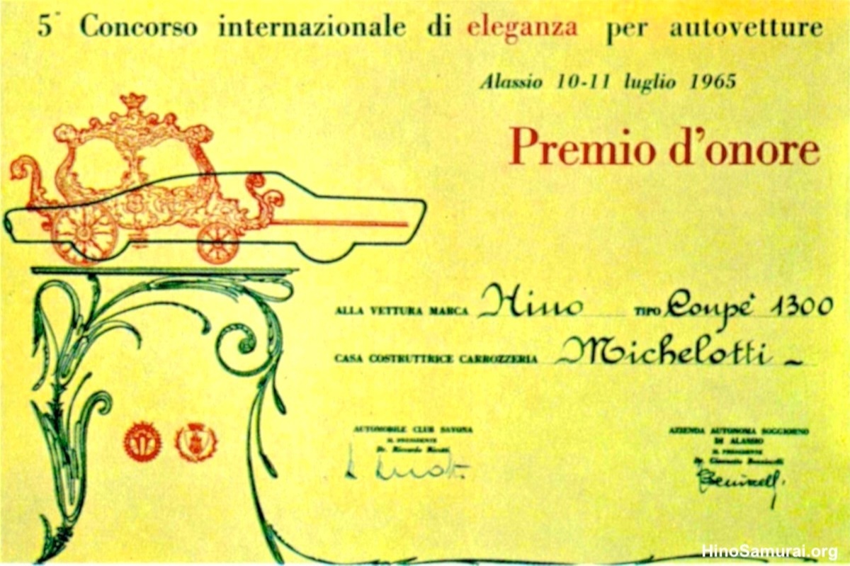 1965年7月10〜11日、フランス,ニースに近い紺碧の地中海に面したイアリア、アラッシオ (Alassio) の国際自動車エレガンスコンクールで、日野コンテッサ1300クーペ名誉大賞(Premio d’onore)セダン一位に輝きました。ミケロッティ氏のデザイン技術と日野のエンジン・シャシーなどの実装技術が欧州で評価された瞬間でした。