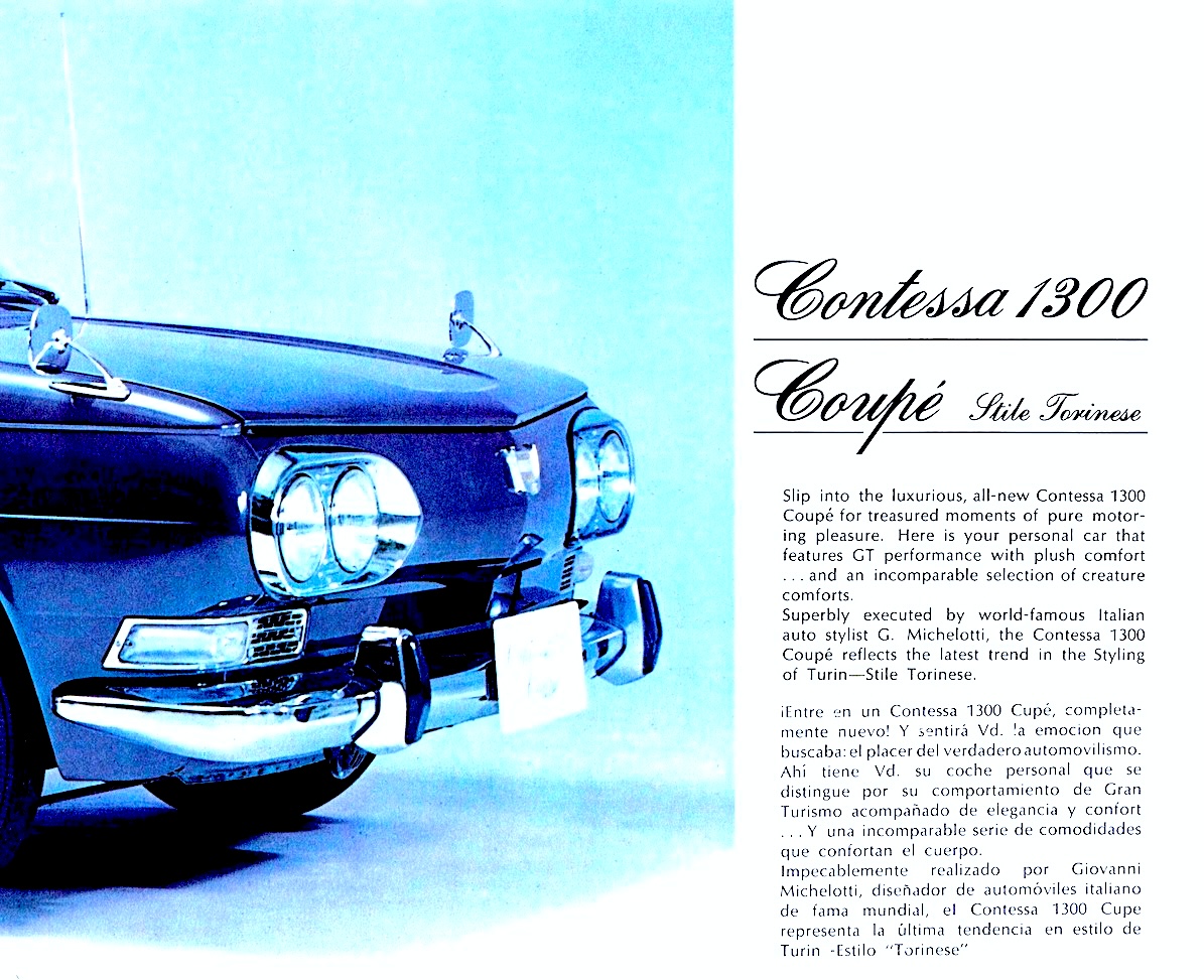 1966年4月13〜24日:コンテッサ1300、バロセロナ・オートショーに昨年に引き続きスペイン代理店タバコス社を通じて、コンテッサ13003M、4M、クーペを出品。日本から唯一の参加となる。(参考:後の7月に作成されたスペイン語版カタログ)