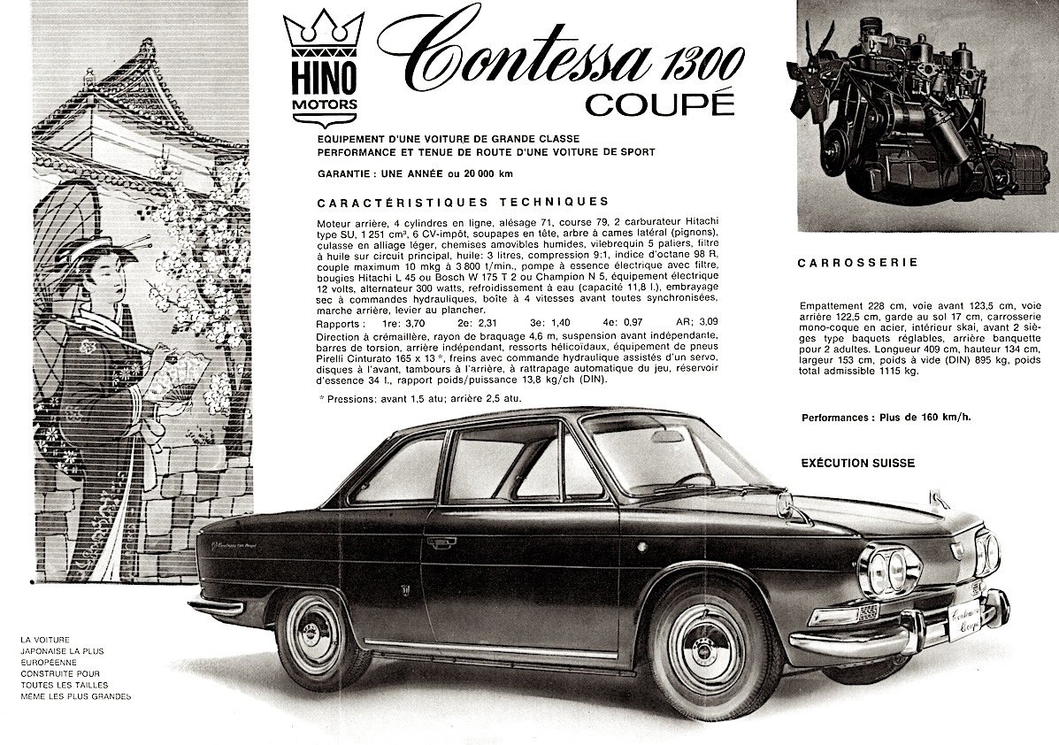 1966年3月10〜20日:コンテッサ1300、スイスのジュネープ市で開催されたジュネーブショーに日野オートモービル社と共同で、屋内展示場にコンテッサ1300セダン、クーペ各1台、屋外に試乗車として同じくセダン、クーペ各1台を出品。(参考:当時のモノクロカラーカタログ – フランス語)