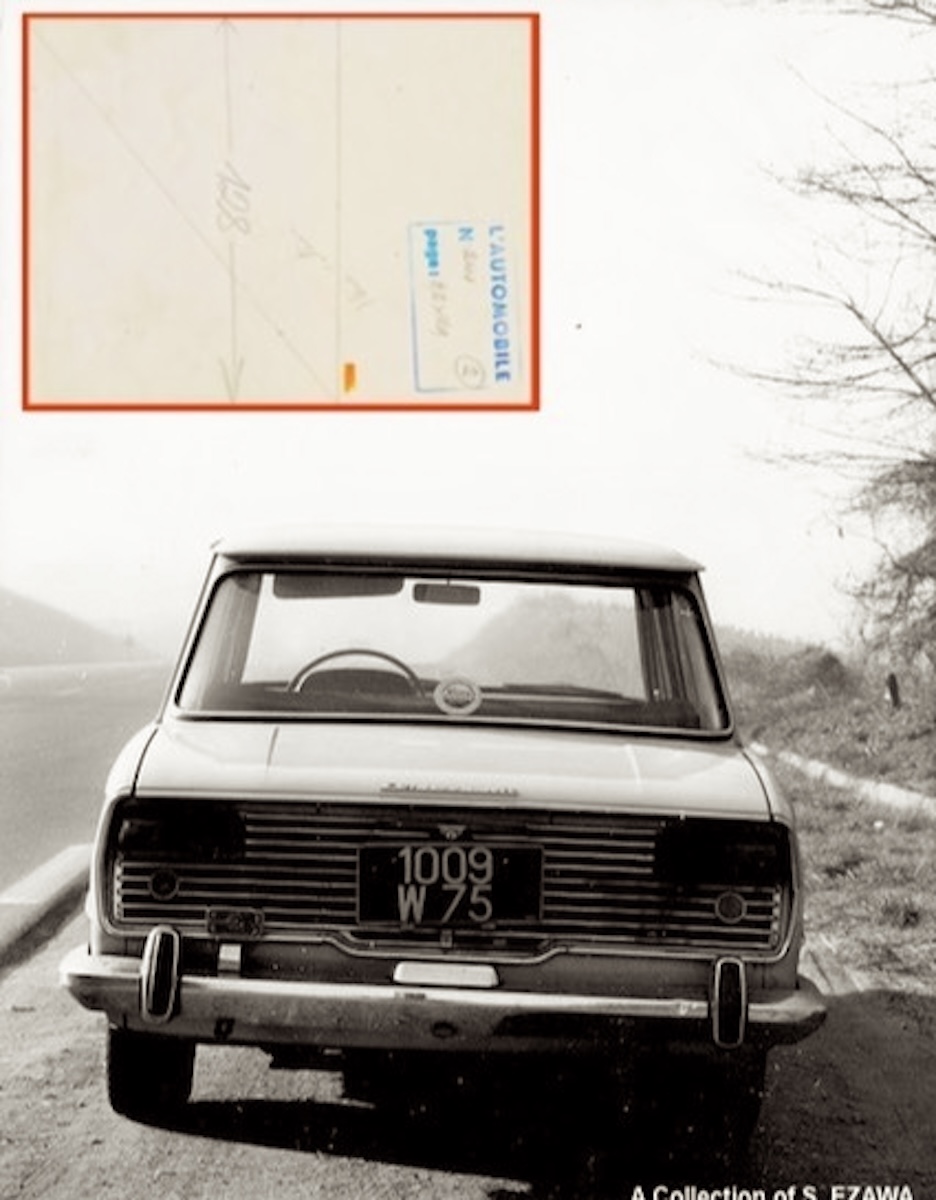 画像の白いコンテッサセダン (1009 W 75)、L’AUTOMOBILEの1965年5月号の試乗に使用された個体、この写真もこの古本屋で入手しました。
