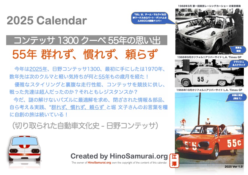 これはいけないと思い、当初は趣味的なポイントが中心でしたが、年初に『日野研究』の成果含めて、せめて記憶にだけでも当時の関係者も思いを盛り込んでささやかですがカレンダーを制作しております。家族やごく少数の友人に配布しております。